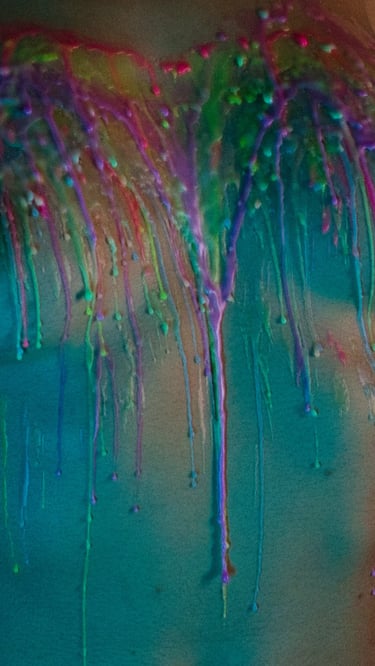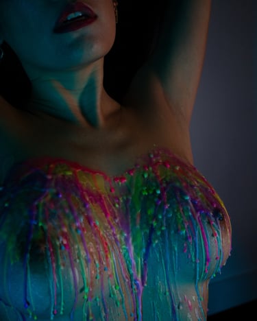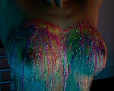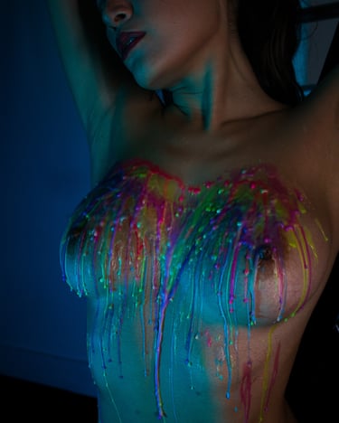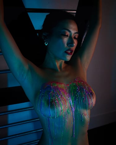 As the layers built, the pace slowed even further. Color gathered and followed the natural curves of her body, shaped by gravity rather than intention, flowing and settling in ways that could never be planned or repeated. Nothing looked rigid or structured like rope. It felt organic and alive, the surface of her skin marked by warmth, texture, and the quiet aftermath of everything she had just felt.